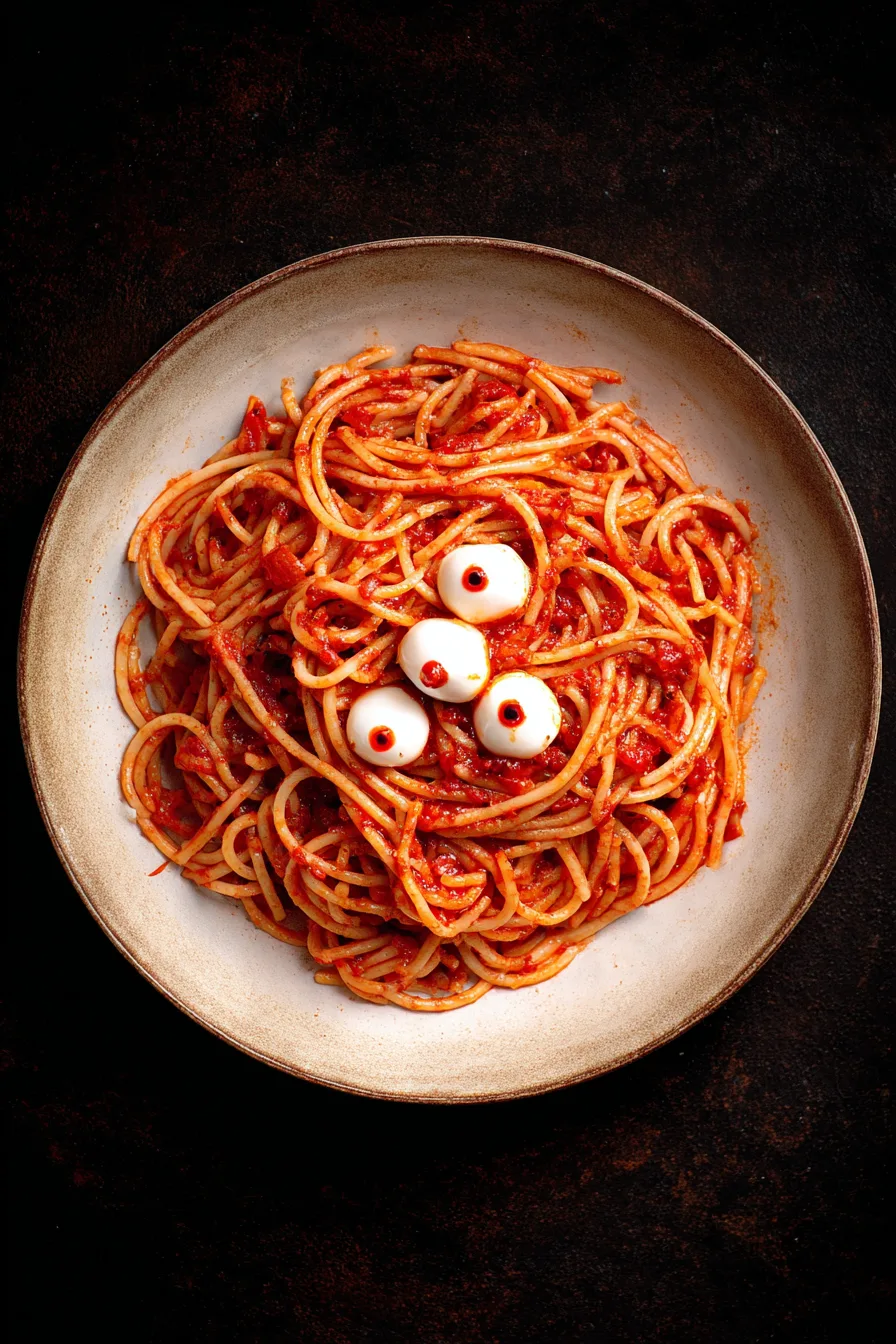 - Garnish: Scatter “eyeballs” strategically across the pasta, not just on top