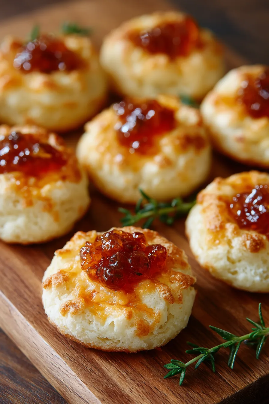 Present these Cheesy Thumbprint Appetizers with Hot Pepper Jelly on a rustic wooden board surrounded by fresh herbs for an Instagram-worthy display. Pair with crisp white grape juice or sparkling apple cider to complement the spicy-sweet flavors.