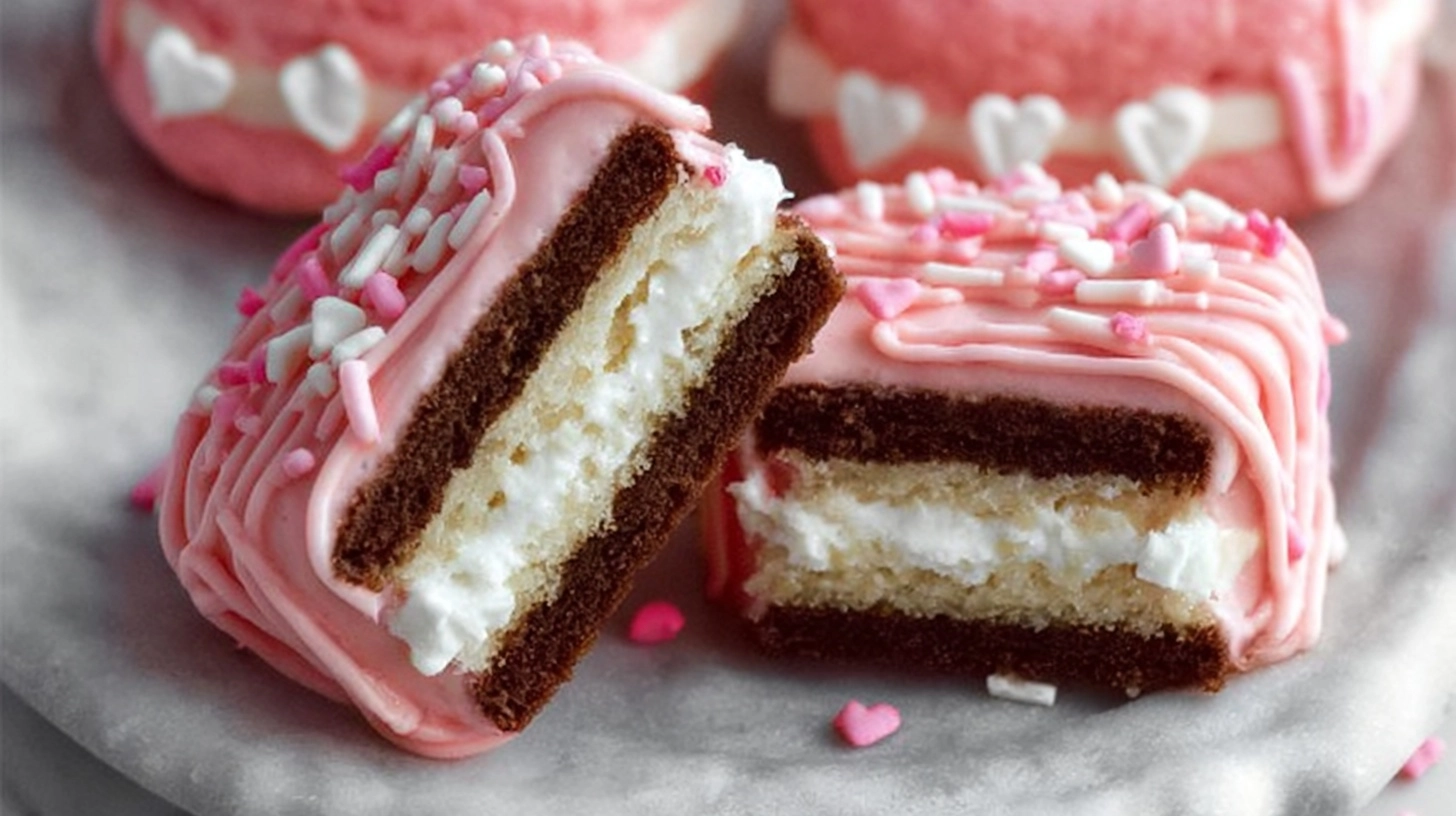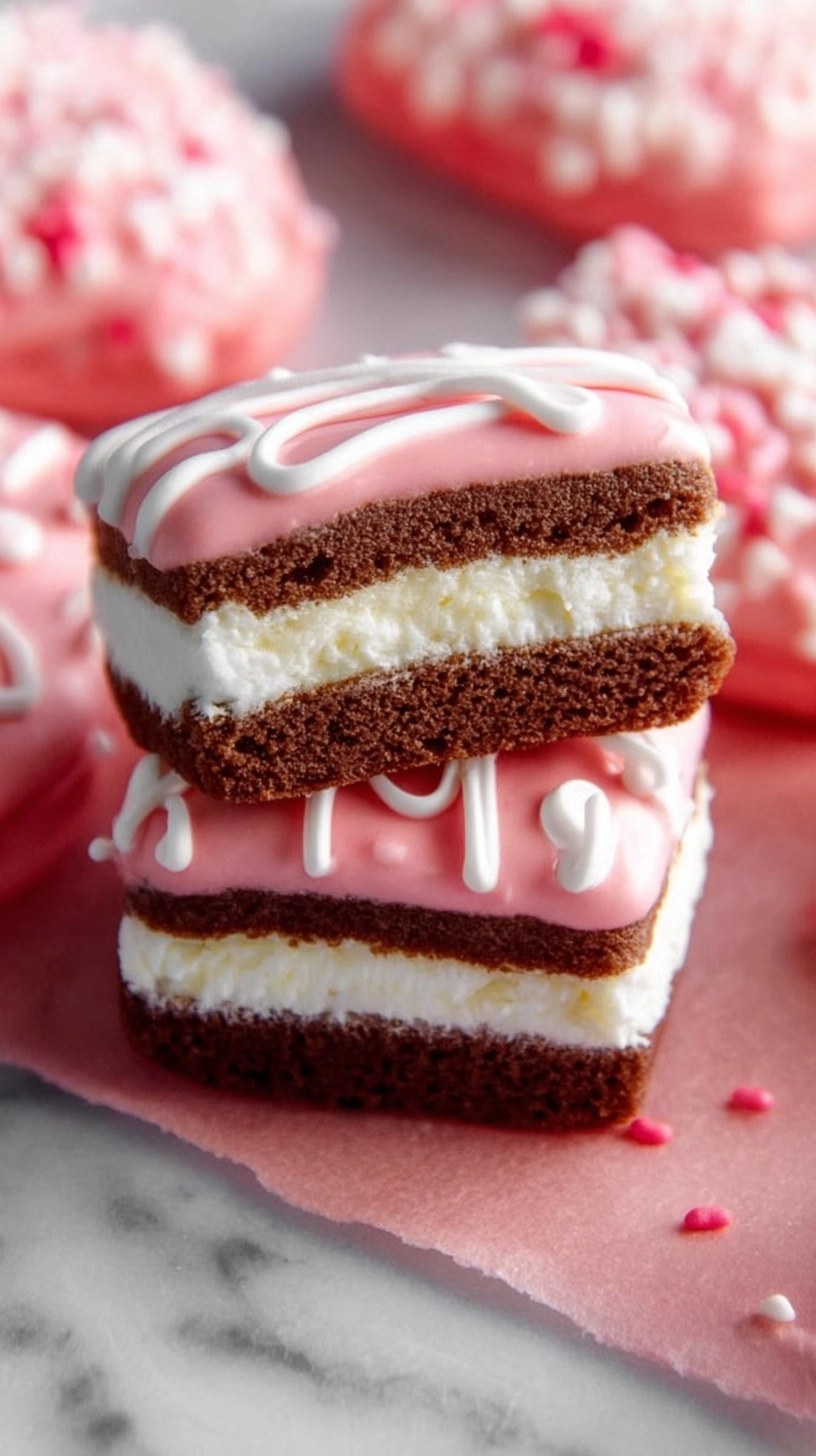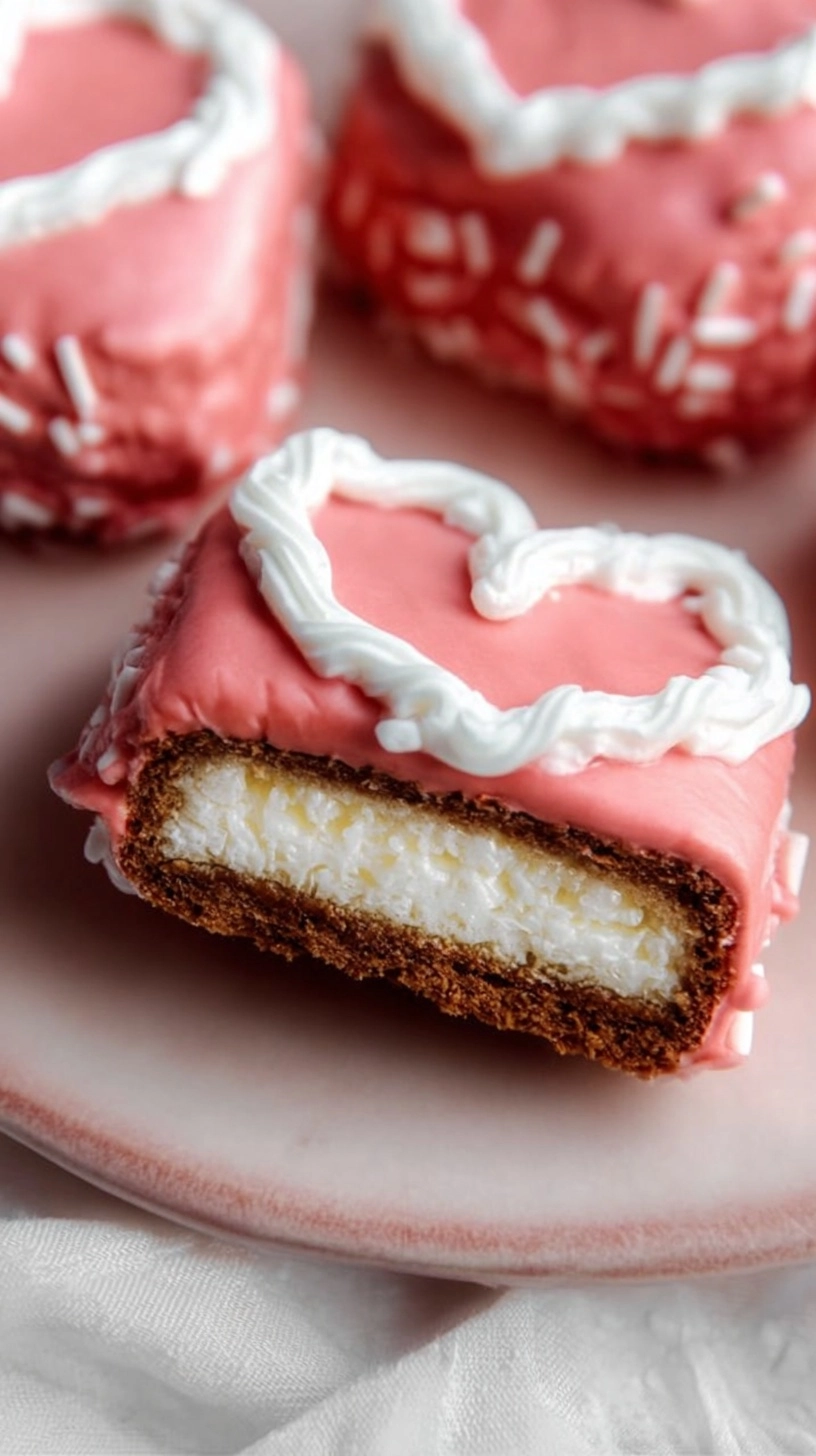 Present these copycat Little Debbie Valentines cakes on vintage cake stands for nostalgic appeal, or package individually in cellophane bags tied with ribbon for gift-giving. Pair with fresh strawberries and vanilla ice cream for an elevated dessert experience.