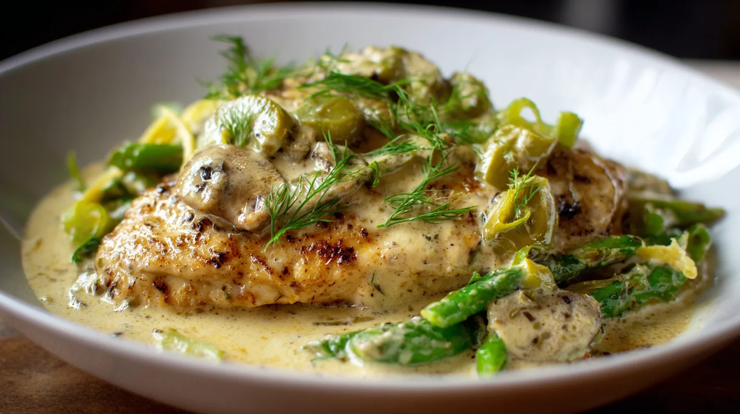 Return the seared chicken to the skillet, nestling it into the creamy sauce. Simmer for 3-4 minutes to heat through. Remove from heat and stir in fresh lemon juice, chopped dill, and Parmesan cheese. Taste and adjust seasoning with salt and pepper as needed.