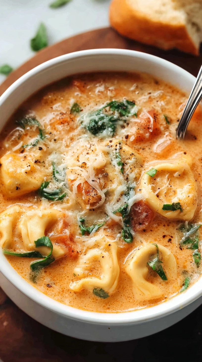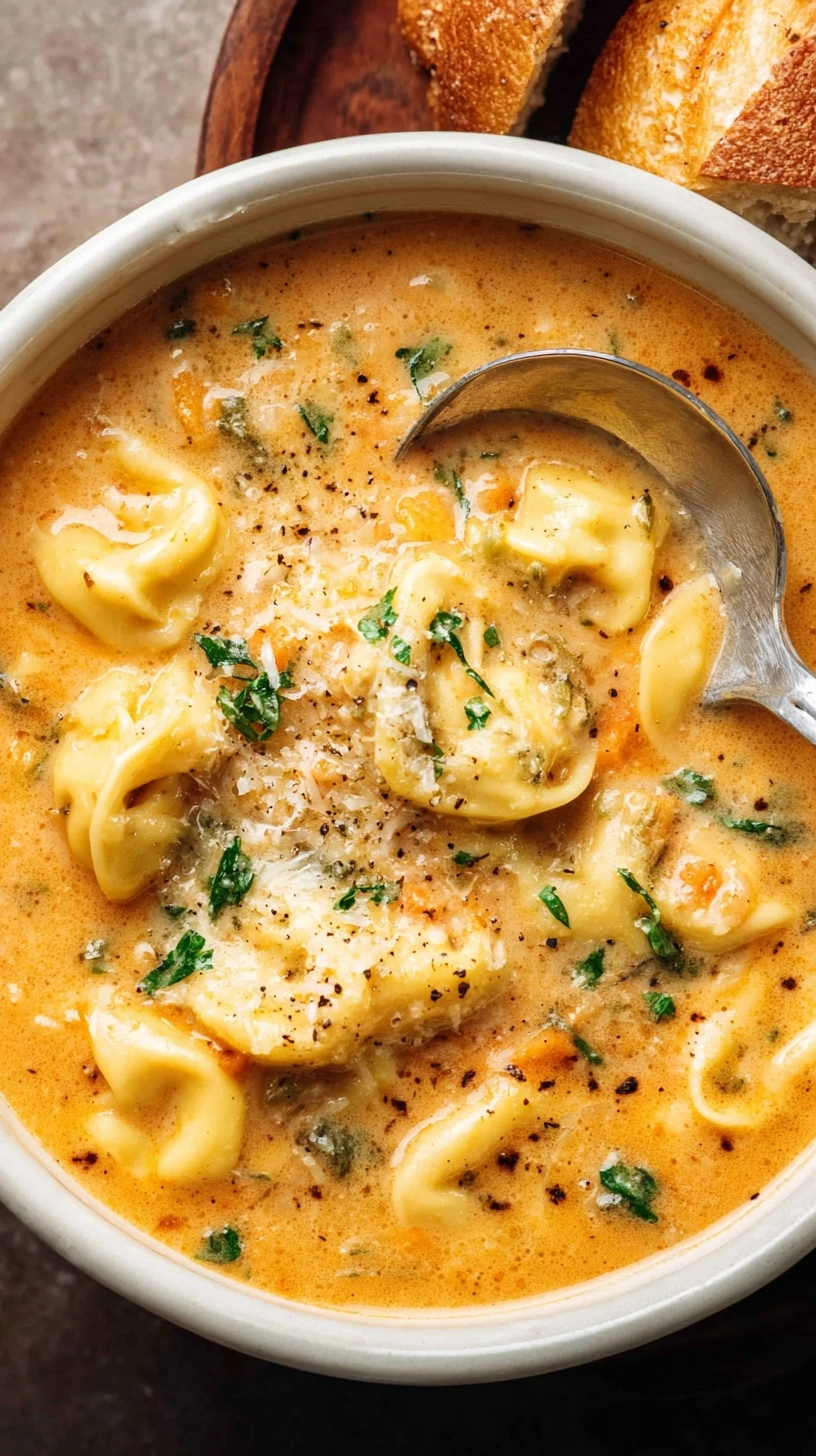 Serve this creamy tortellini soup in warmed bowls topped with extra Parmesan cheese, fresh basil leaves, and a drizzle of good olive oil. Pair with crusty sourdough bread, garlic breadsticks, or a simple arugula salad dressed with lemon vinaigrette to cut through the richness. For entertaining, set up a soup bar with toppings like toasted pine nuts, sun-dried tomatoes, and fresh herbs, allowing guests to customize their bowls. The soup also pairs beautifully with grilled cheese sandwiches or herb-crusted focaccia for a complete comfort meal experience.