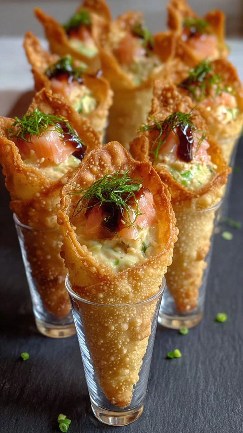 Handle wonton wrappers gently when shaping, brush with oil for flexibility, and don’t overbake. Properly baked cones should be golden but not dark brown.