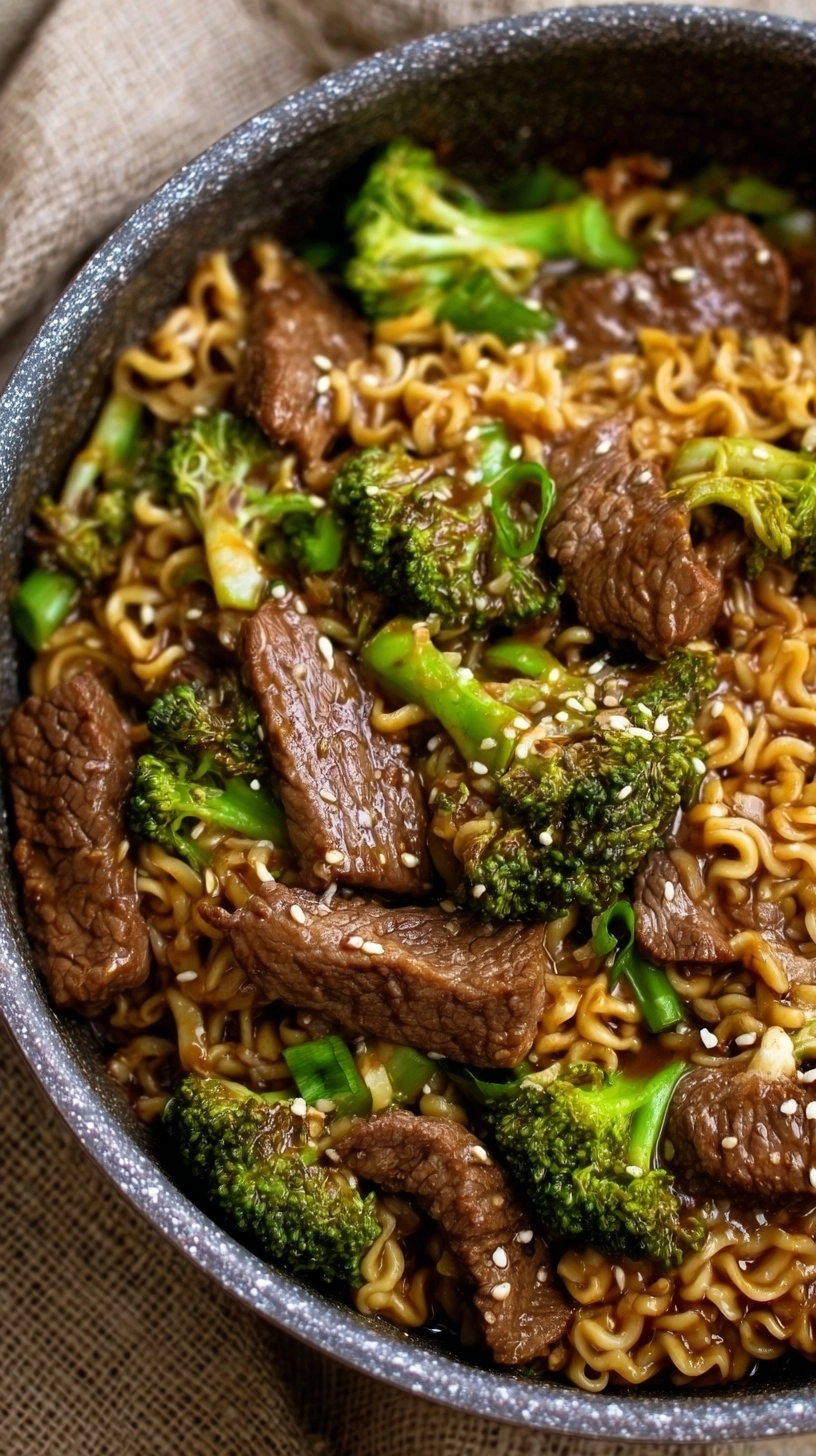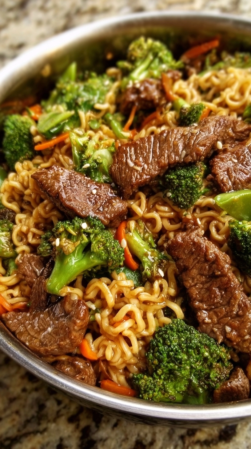 Store leftover beef and broccoli ramen stir fry in airtight containers for up to 3 days in the refrigerator. The dish reheats best in a skillet over medium heat with a splash of broth to revive moisture. Avoid microwaving, which can make the beef tough and noodles mushy. For meal prep, store sauce separately and combine just before serving. Freeze portions for up to 1 month, though texture may be slightly altered upon thawing.