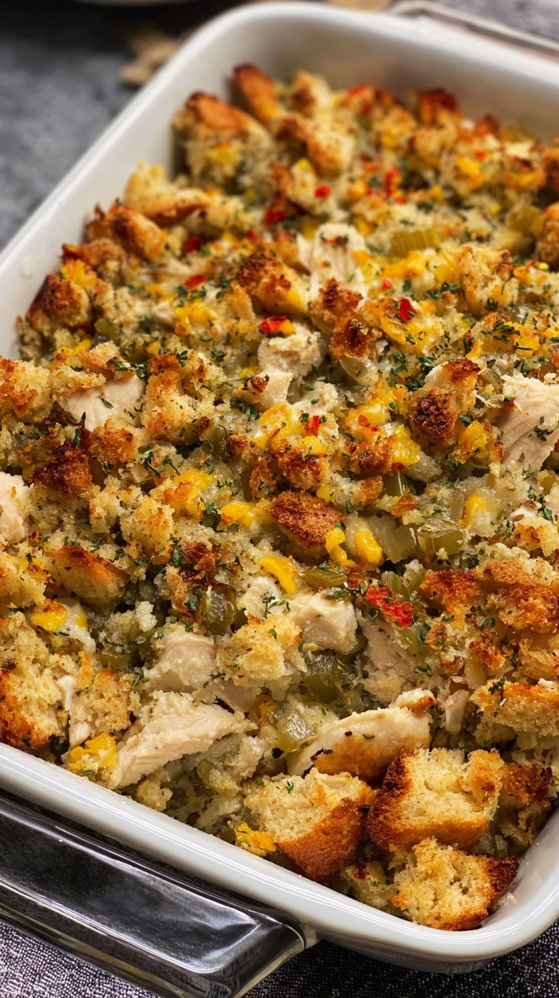Each generous serving of this Easy Chicken and Stuffing Bake provides approximately 385 calories, making it a satisfying yet reasonable dinner option. The nutritional profile includes 32 grams of high-quality protein (supporting muscle maintenance and satiety), 28 grams of carbohydrates for sustained energy, and 16 grams of fat primarily from beneficial sources like cheese and butter.
