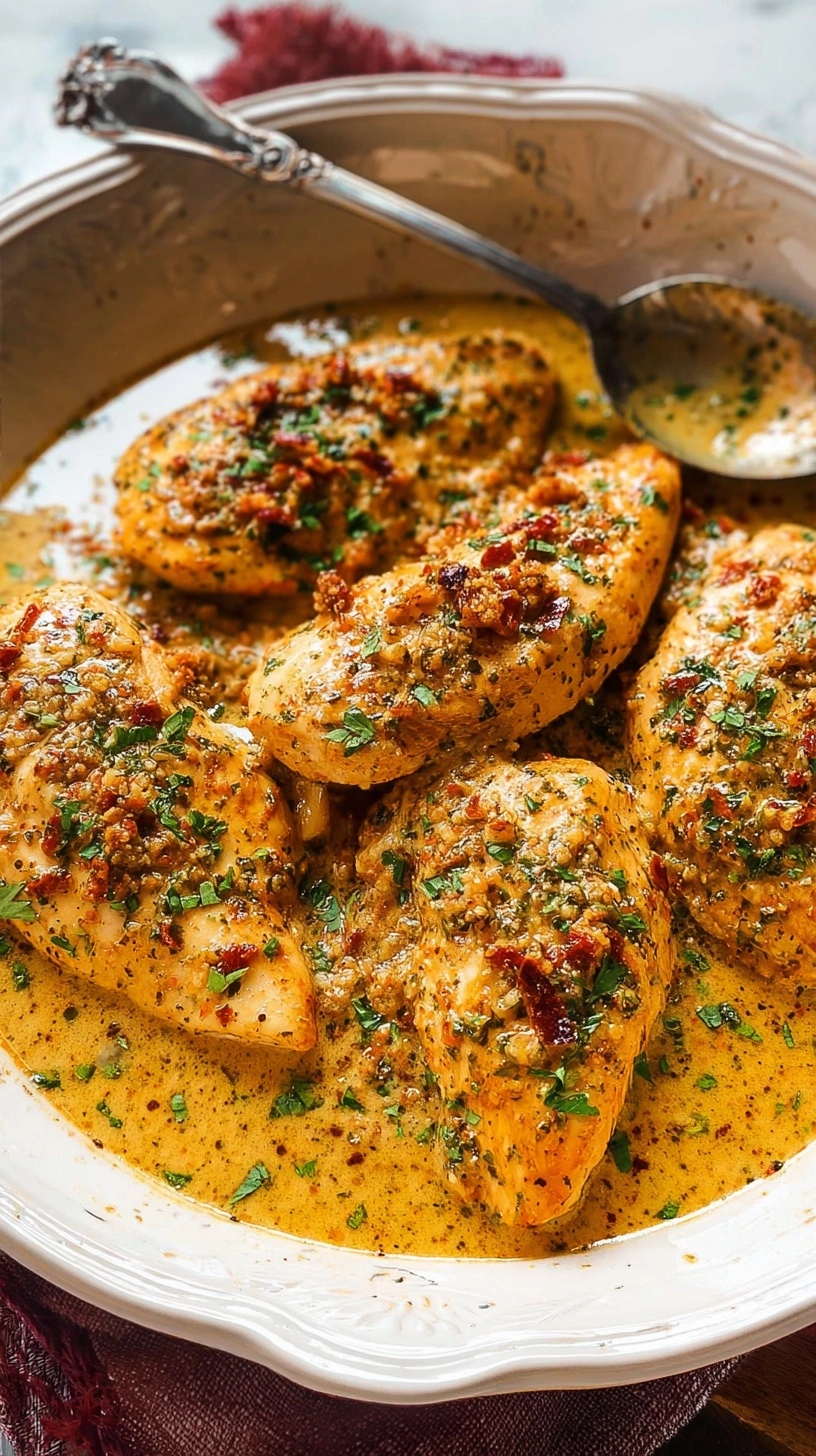 Stir in Parmesan cheese, fresh thyme, and half the basil until smooth. Return chicken to the skillet, spooning sauce over each piece. Simmer for 2-3 minutes to reheat and allow flavors to meld perfectly.