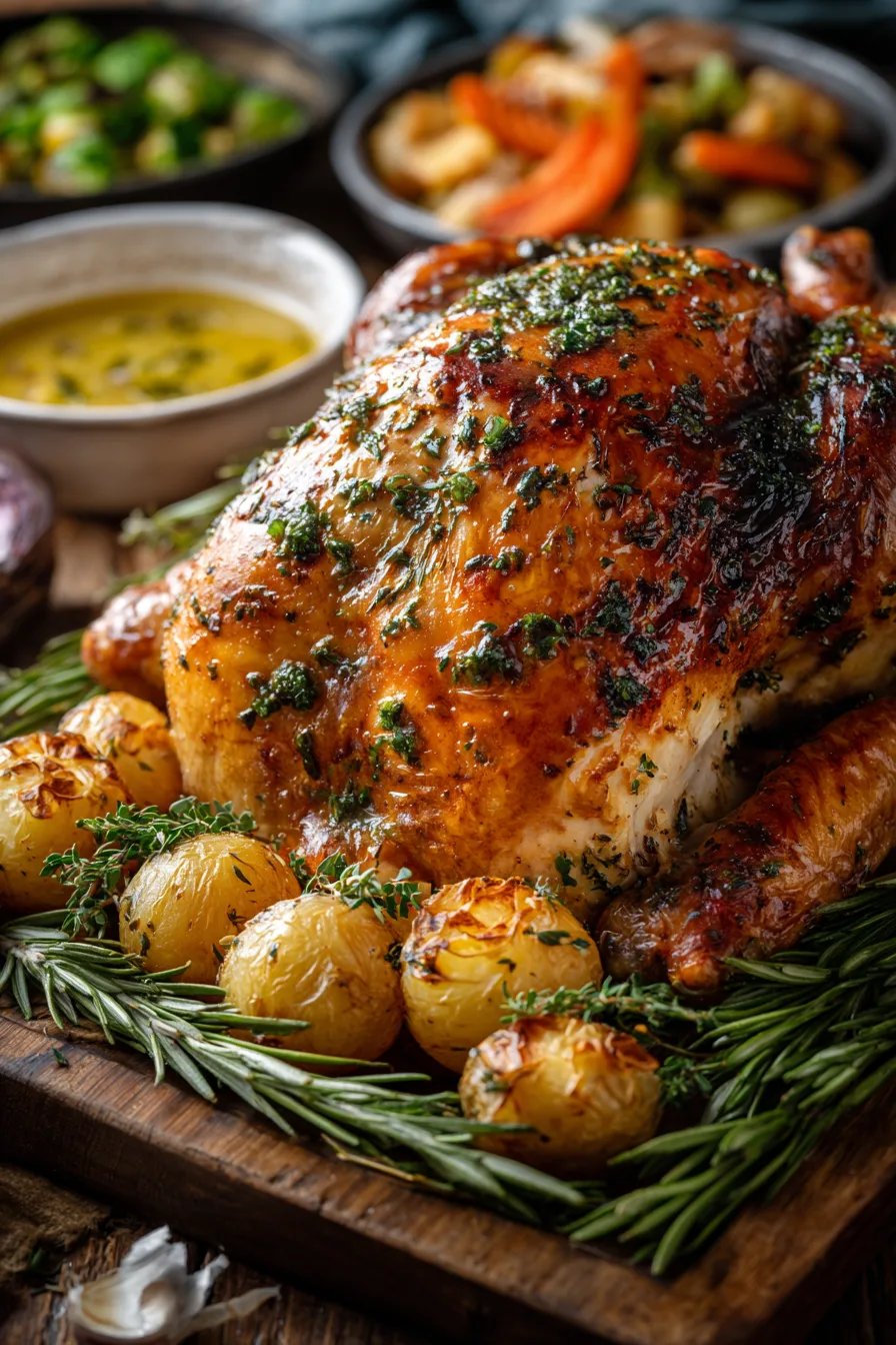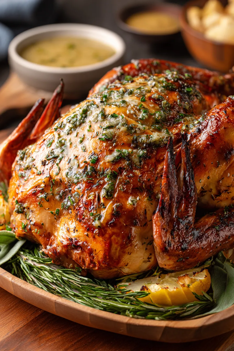 Present your Garlic Herb Butter Roast Turkey as the centerpiece of a harvest-inspired spread featuring roasted root vegetables, cranberry sauce with orange zest, and herb-infused stuffing. The rich, herbaceous flavors pair beautifully with sweet potato purée, green bean almondine, or a fresh arugula salad with pomegranate seeds. For elegant plating, slice the turkey and fan it over a bed of wilted greens, drizzled with pan juices reduced into a light gravy.