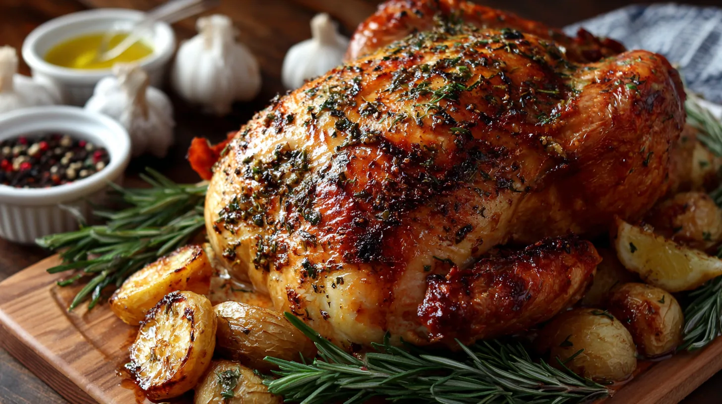 A 4-ounce serving of this Garlic Herb Butter Roast Turkey provides approximately 285 calories, 32 grams of high-quality protein, and 16 grams of fat. Turkey is naturally rich in selenium (providing 44% of daily value), phosphorus, and B-vitamins, particularly niacin and B6. The herb butter adds beneficial antioxidants from fresh herbs while contributing essential fatty acids. This preparation method retains 90% of the turkey’s natural nutrients while adding minimal processed ingredients.