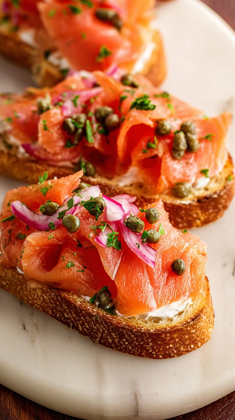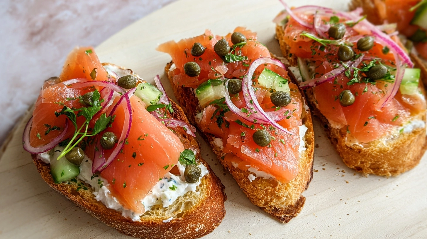 Top each bruschetta with cucumber cubes, a sprinkle of red onion, and 3-4 capers. The key is balance—each bite should contain all components without overwhelming the delicate salmon flavor.