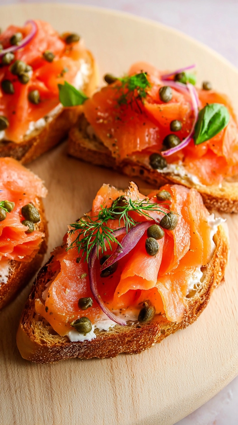 Present your smoked salmon bruschetta on a wooden board or slate platter for rustic elegance, or arrange on white porcelain for modern sophistication. Pair with sparkling water infused with cucumber and mint, or serve alongside a crisp white grape juice for special occasions. These bruschetta complement cheese boards beautifully and work equally well as a light lunch when served with mixed greens dressed in lemon vinaigrette. Consider offering both individual pieces and a “build-your-own” station for interactive dining experiences.