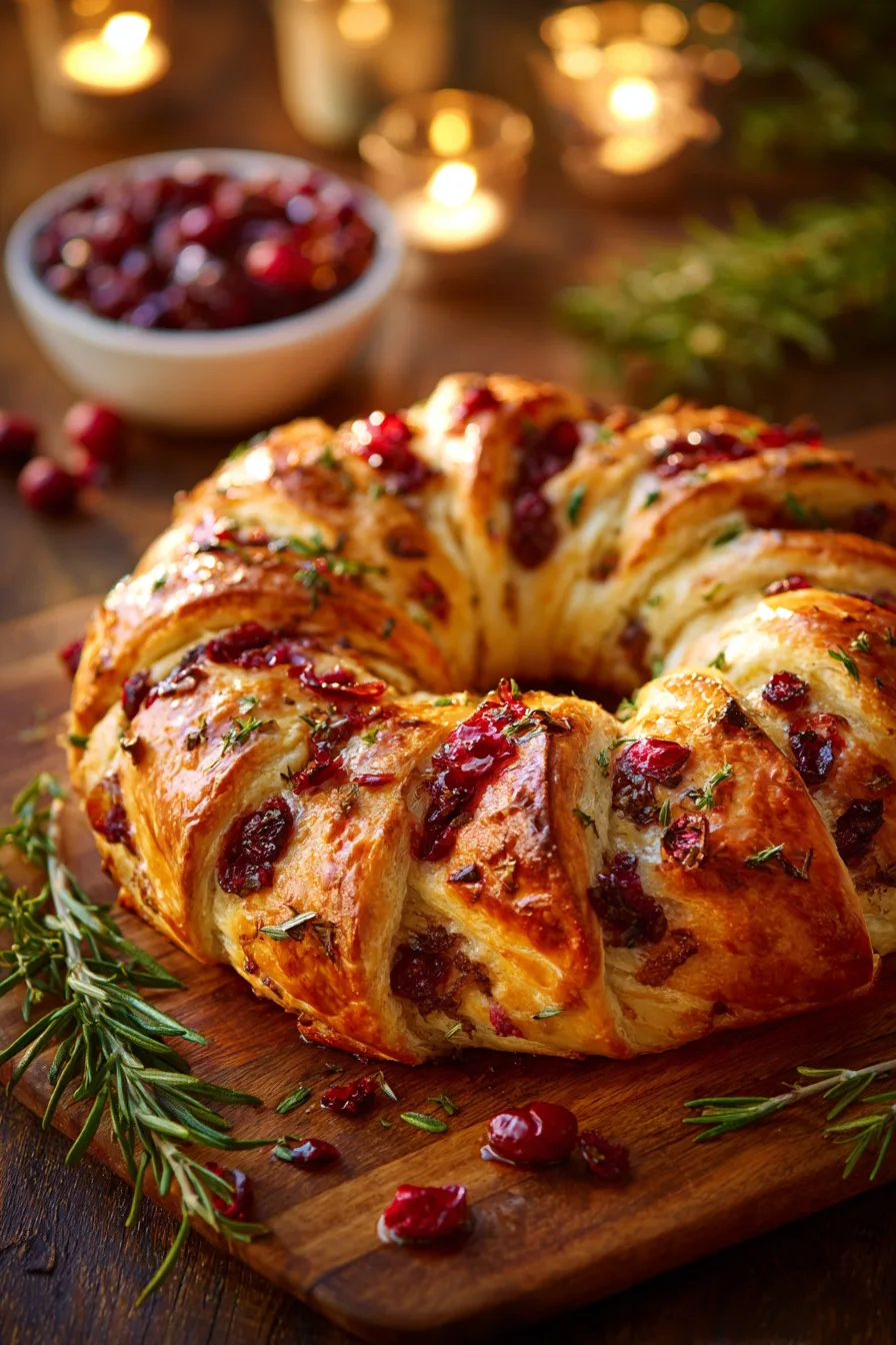 Store leftover turkey cranberry crescent ring in the refrigerator for up to 3 days, wrapped tightly in aluminum foil or stored in an airtight container. For best results, reheat individual slices in a 350°F oven for 5-7 minutes to restore crispiness. The assembled but unbaked ring can be prepared up to 4 hours in advance and refrigerated, then baked just before serving. Freeze baked portions for up to 1 month; thaw overnight in the refrigerator before reheating. For optimal texture retention, avoid microwave reheating, which can make the crescent dough soggy.