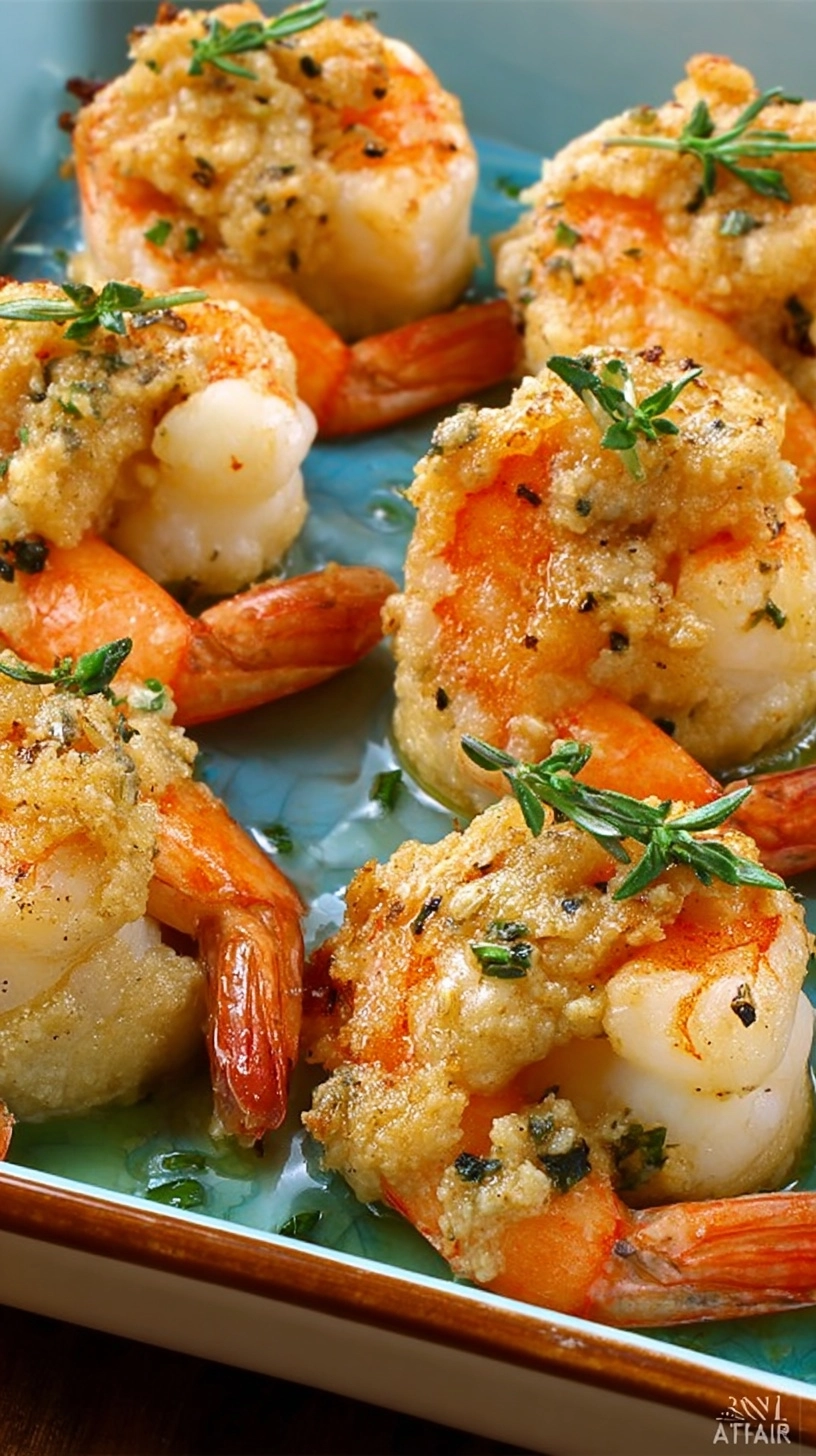 Mix melted butter, additional panko breadcrumbs, Parmesan cheese, and fresh thyme in a small bowl. Sprinkle this mixture over each stuffed shrimp, creating a beautiful golden crown that will provide textural contrast and visual appeal.