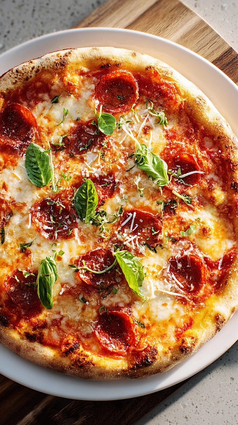 Carefully slide your pizza onto the preheated stone and bake for 10-12 minutes until the crust is golden brown and the cheese is bubbly with slight charring. Remove from the oven and immediately top with fresh basil leaves, allowing their oils to release from the residual heat.