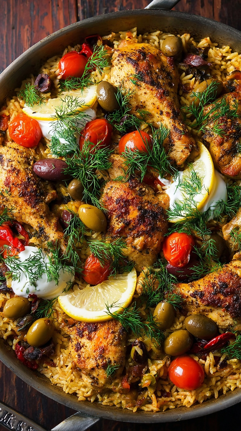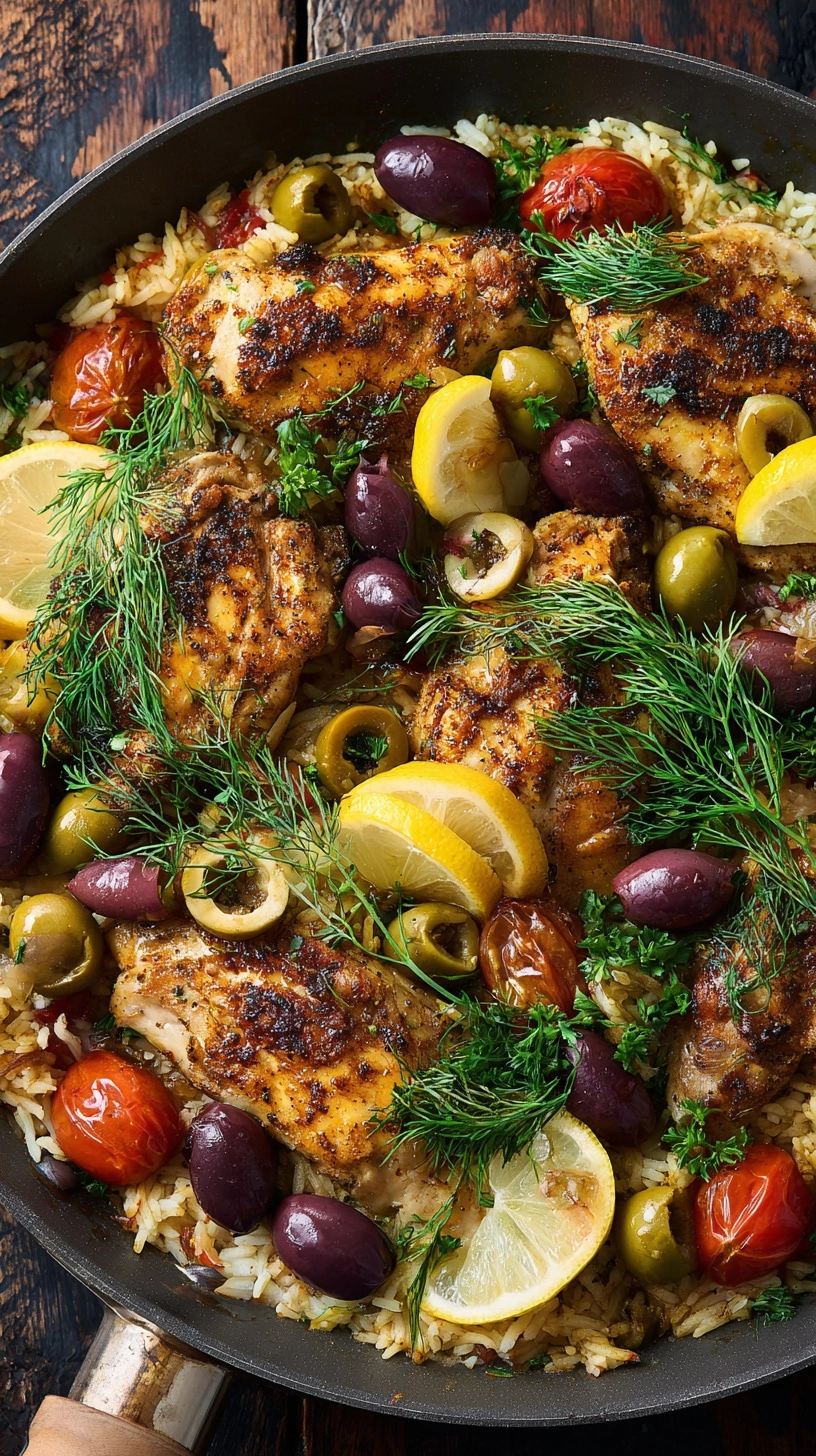 Serve this Mediterranean chicken and rice alongside a crisp Greek village salad dressed with olive oil and red wine vinegar for a complete meal experience. The dish pairs beautifully with warm pita bread or focaccia for soaking up the flavorful pan juices. For entertaining, present the dish family-style directly from the cooking pan, garnished with fresh herbs and lemon wedges. Consider offering a side of tzatziki or hummus to enhance the Mediterranean theme and provide cooling contrast to the warm, savory main course.