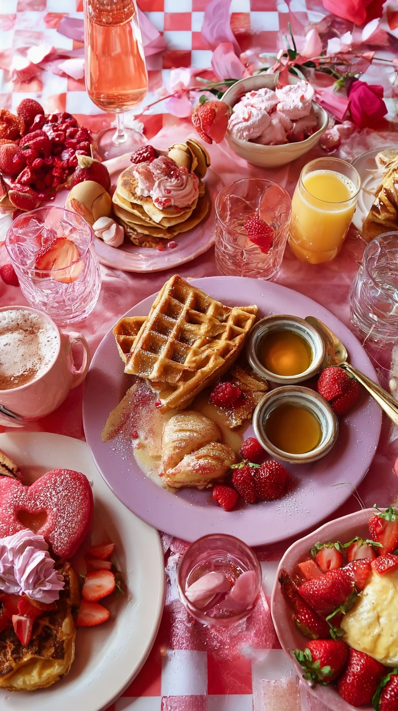 Present your Pink and Red Galentine’s Day Brunch on white or clear glass plates to showcase those stunning pink hues. Arrange pancakes in overlapping circles, drizzle berry compote artistically around the plate’s edge, and finish with dollops of whipped cream. Fresh mint leaves add a pop of complementary green color. Consider serving alongside rose-infused sparkling water with fresh berry ice cubes, or create a “build-your-own” pancake bar with various toppings like toasted coconut, chopped nuts, and edible flowers.