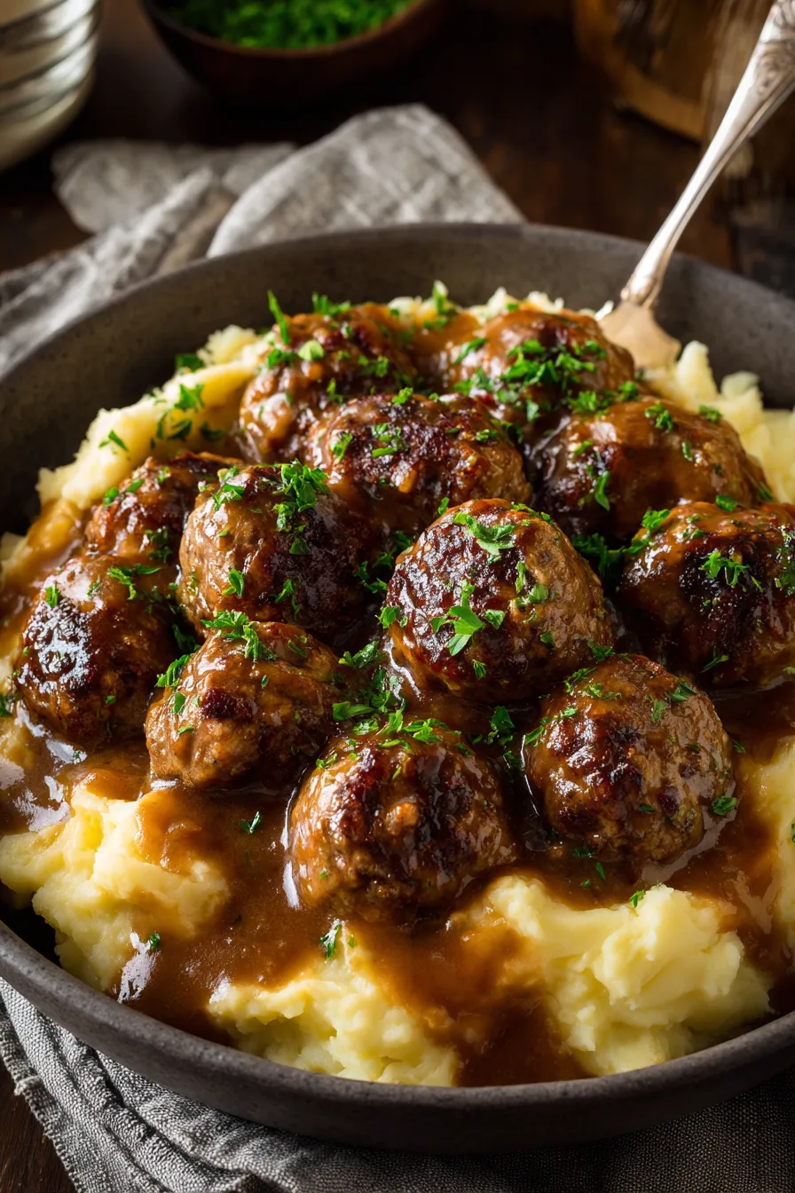 Avoid overmixing meatball ingredients, which creates dense, tough results—gentle folding preserves tender texture. Don’t skip browning meatballs properly; this crucial step develops flavor complexity that can’t be replicated later. Never add cold liquid to your roux suddenly, as this creates lumps in the gravy. Resist the urge to over-mash potatoes, which releases excess starch and creates gummy texture. Finally, don’t rush the simmering process—allowing meatballs to braise slowly in gravy ensures they remain juicy while absorbing maximum flavor.
