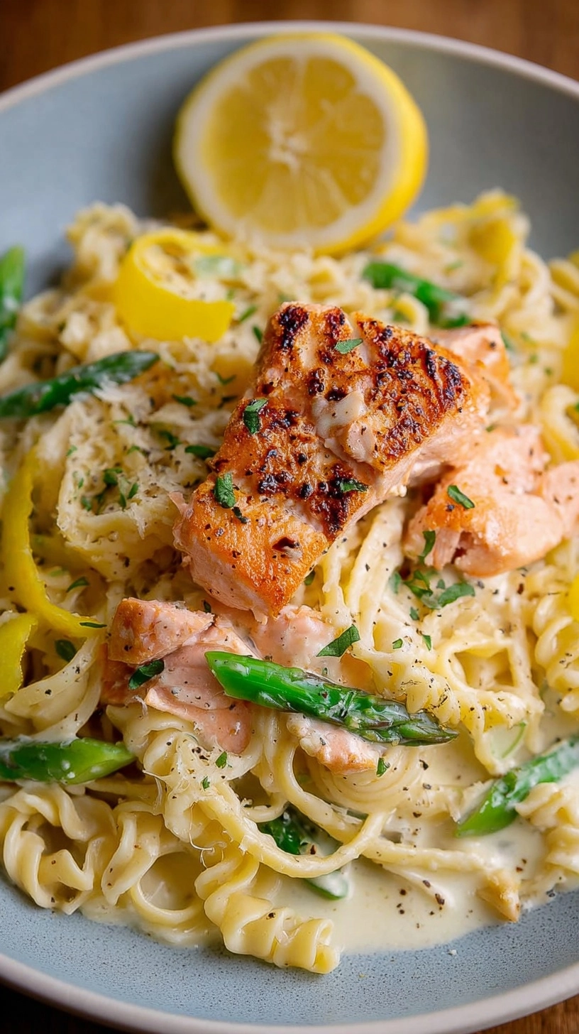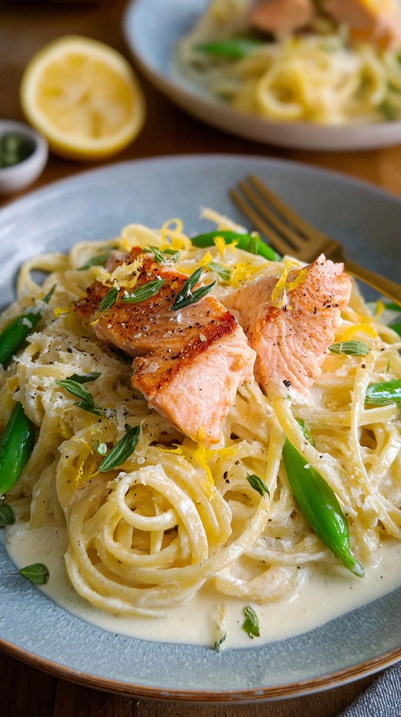 Present your Salmon Pasta with Lemon Cream Sauce in warmed bowls to maintain optimal temperature. Garnish with additional fresh dill, lemon zest, and a sprinkle of red pepper flakes for color contrast and subtle heat. Pair with a crisp arugula salad dressed with lemon vinaigrette to complement the rich sauce. Serve alongside roasted asparagus or steamed broccoli for added nutritional value. For special occasions, top with toasted pine nuts or breadcrumbs for textural interest.